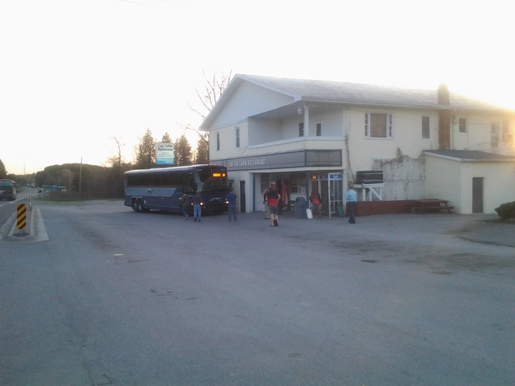 You need to know that the buses were ALWAYS full. Two sometimes three at a time would stop at the Tweed Esso station, the Log Cabin restaurant or the Trenton ONroute. Weary travellers would pour out from the buses to pee, smoke and eat. Public travel on the bus was never roomy. It was cramped, long and sometimes uncomfortable. If you were lucky you had the seat next to you for yourself. That rarely happened.